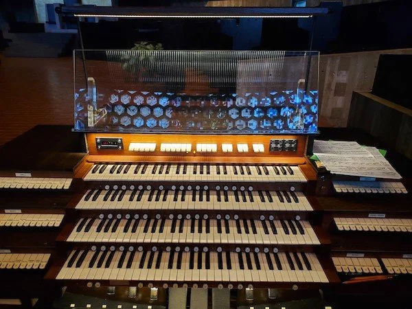 + Cornet 32’ comprised of 10 harmonic pitches in the 32’ series, 5 derived from the Principal 16’ (C), Subbass 16’ (10 2/3’ G and 5 1/3’ G), Octave 8’ (C), and Choralbass 4’ (C), as well as five independent ranks at the following pitches: 6 2/5’ (E), 4 4/7’ (A#), 3 1/2’ (D), 2 3/4’ (F#), and 2 1/2’ (G#).